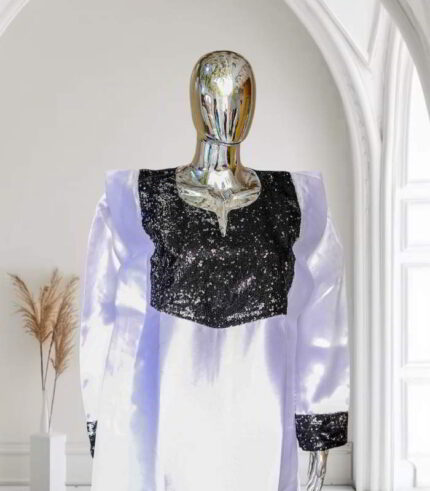 Original price was: US$75.00.US$45.00Current price is: US$45.00.Nifemi Collection: Crystal Cascade Boubou Kaftan – Embroidered Opulence with Shimmering Stones